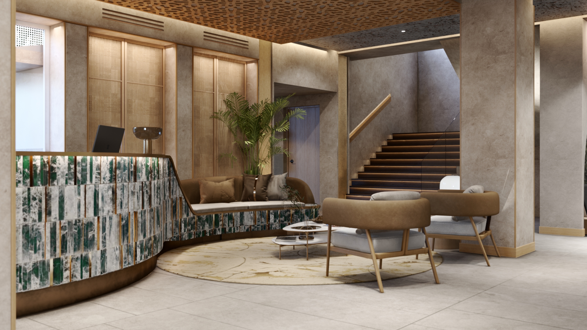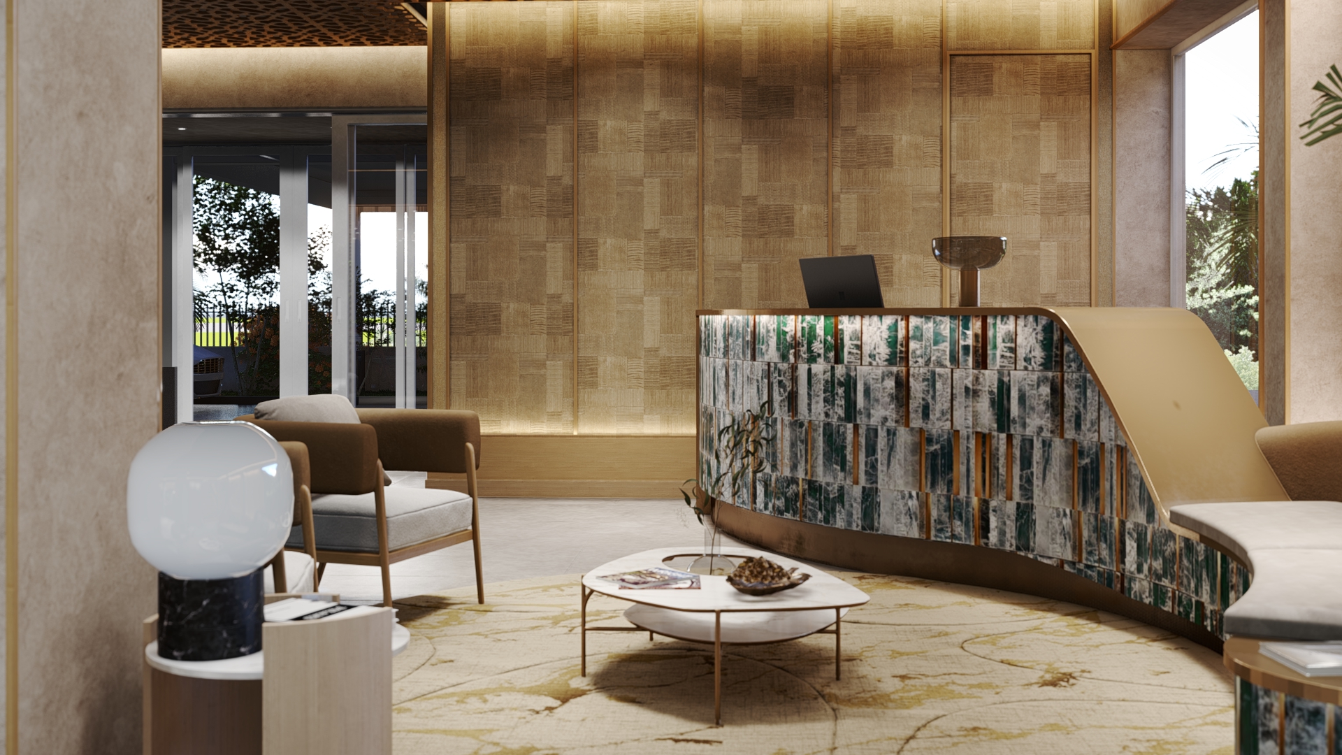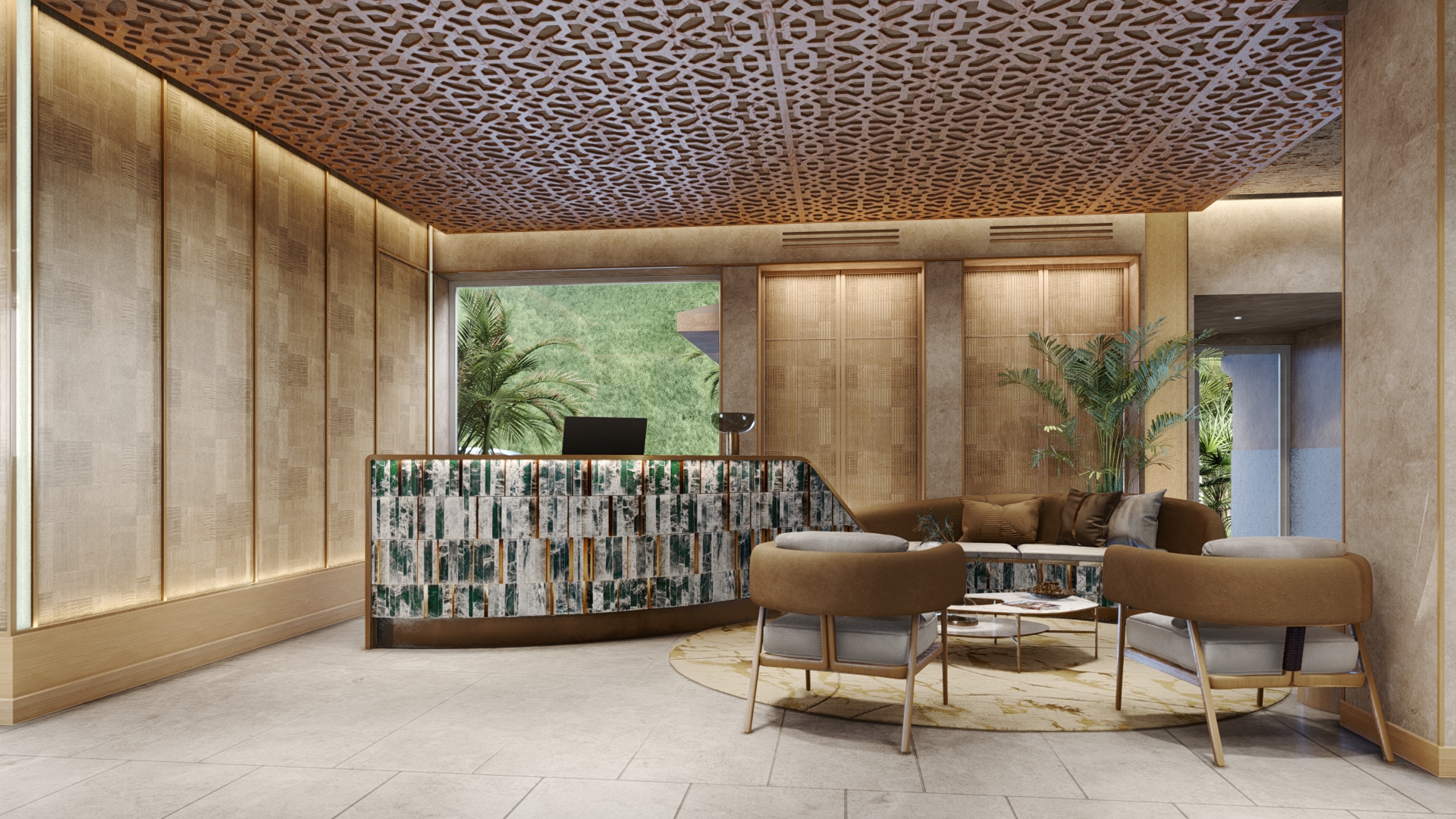 From its inception, the hotel was envisioned as a mirror of nature. The reception welcomes guests with curved sofas and fixed wooden furnishings, evoking the warmth of the earth and the embrace of the trees. An organic paneled ceiling recreates the silhouette of the night under the moonlight, inviting a poetic yet tangible experience. Every detail speaks with the landscape, transferring the sensory richness of the jungle into every corner.