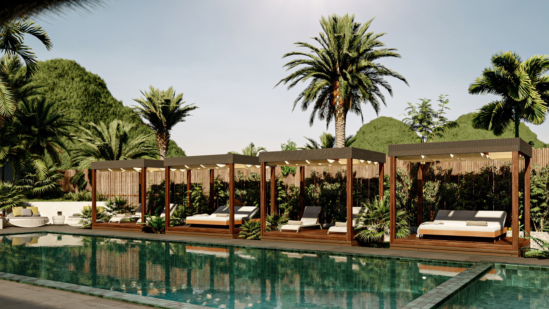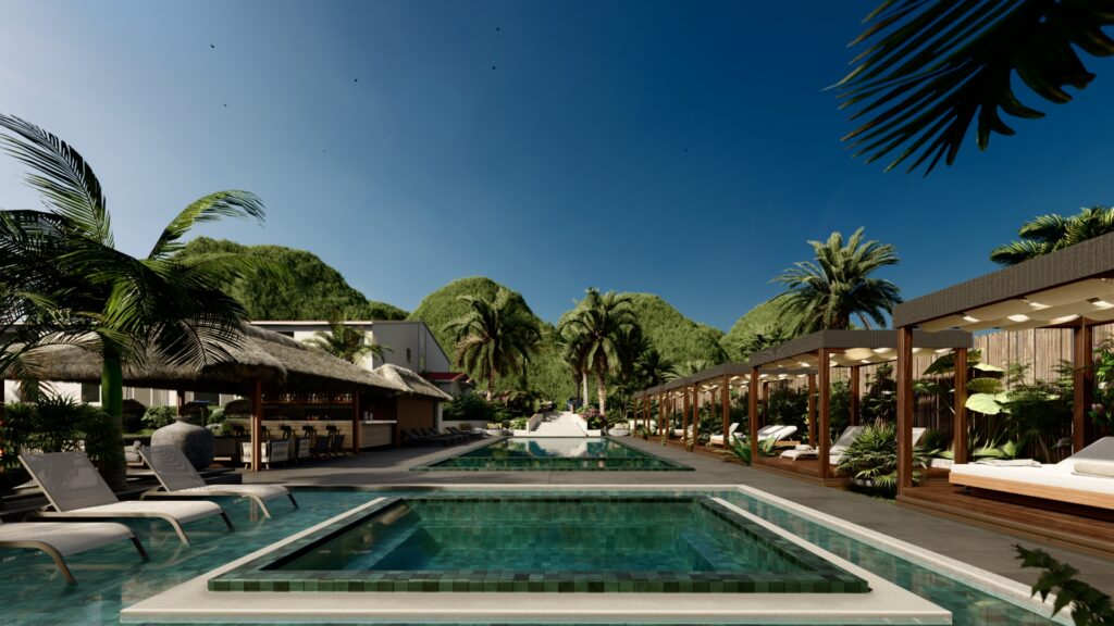 The pool area was transformed into the core of immersive experiences. Its design was expanded to include two new zones: an infinity pool for children with a modulated bottom, and a private island next to the bar, enveloped by a reflecting pool that offers both intimacy and contemplation. Surrounding immersion points were created to allow guests to experience the jungle through all senses: the breeze of air, the warmth of fire, the strength of earth, and the fluidity of water. The hotel becomes an emotional journey where nature itself guides every step.