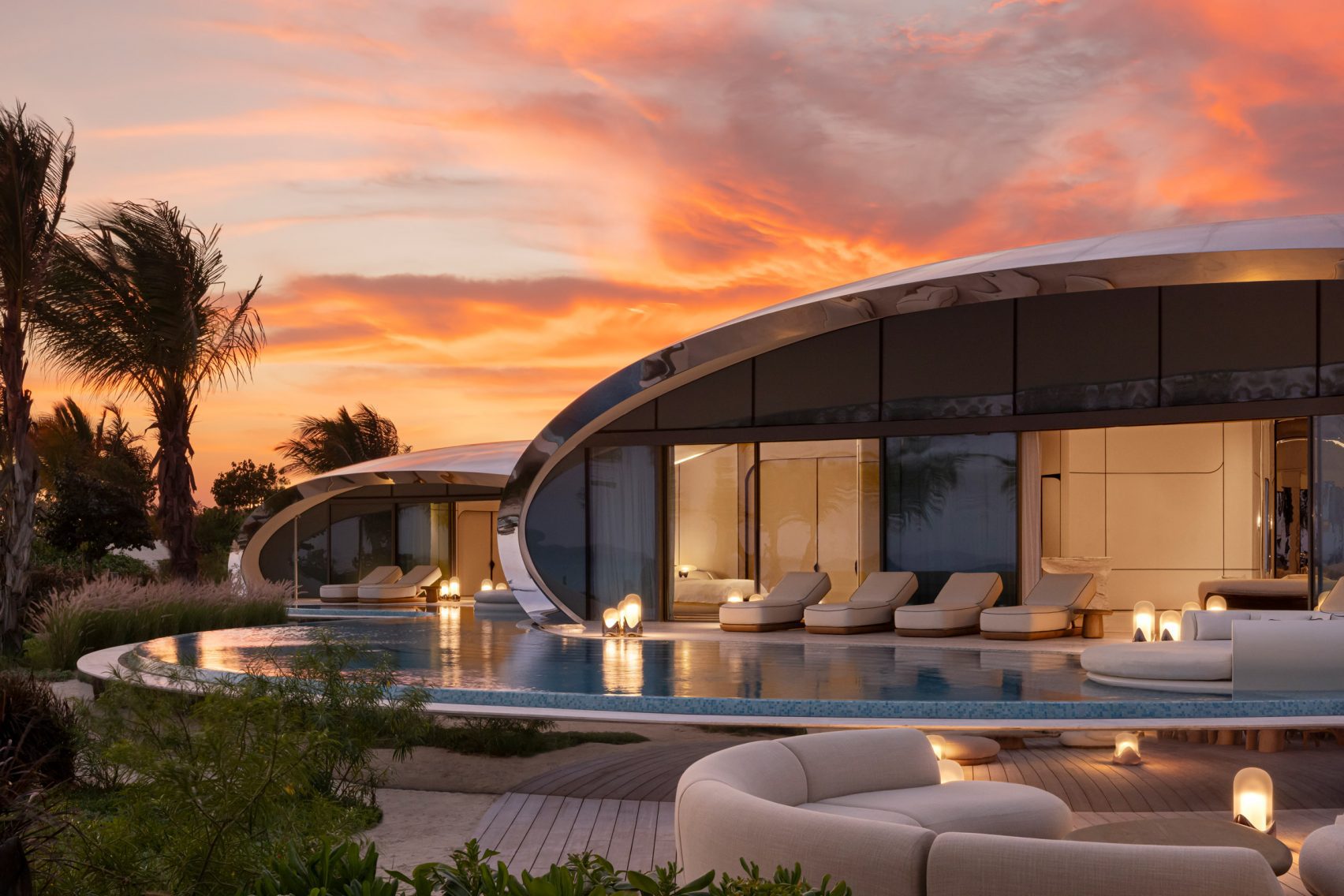 The visionary studio Killa Design, renowned for projects such as Dubai’s Museum of the Future, conceived Shebara as a series of spherical villas that resemble a string of pearls floating across the sea. Each villa is clad in polished stainless steel, reflecting the sky and water to merge seamlessly with the landscape.
