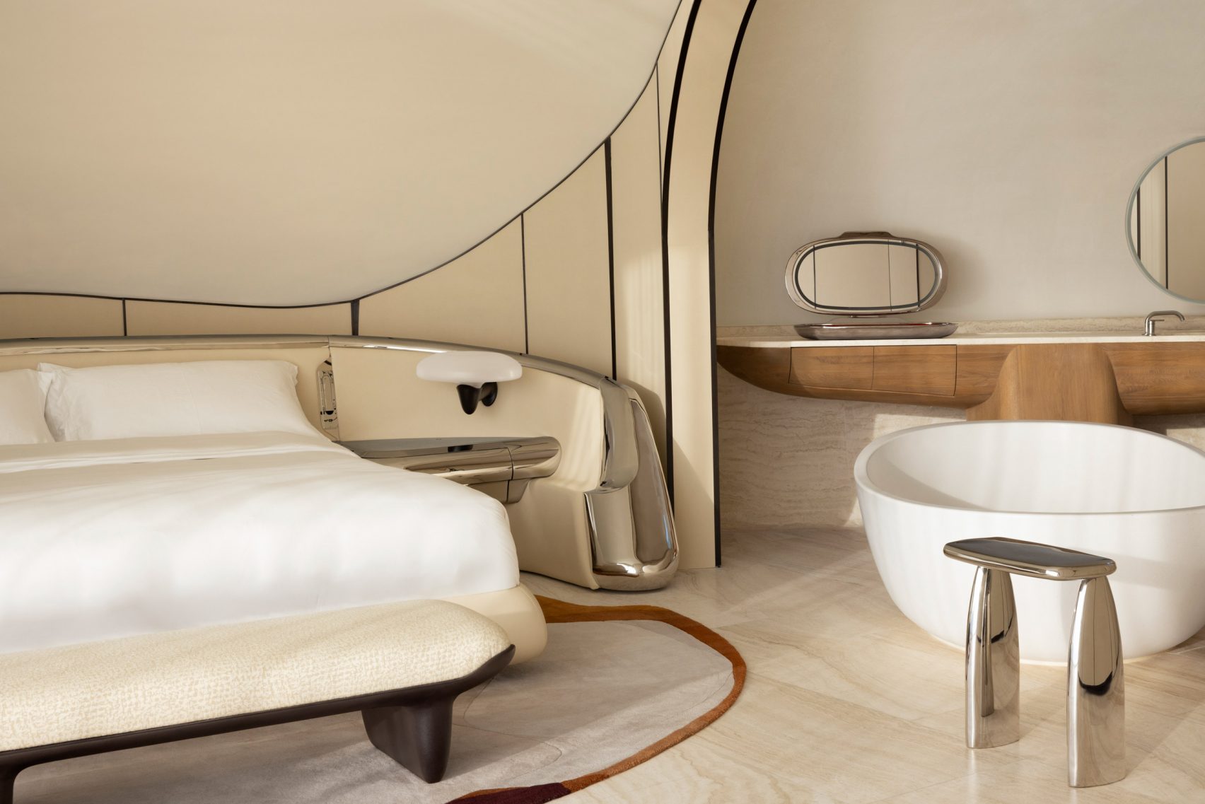 The interior design was entrusted to Toronto-based Studio Paolo Ferrari, which approached the project with a philosophy described as “transcendental”: dreamlike spaces that balance futuristic audacity with artisanal warmth.